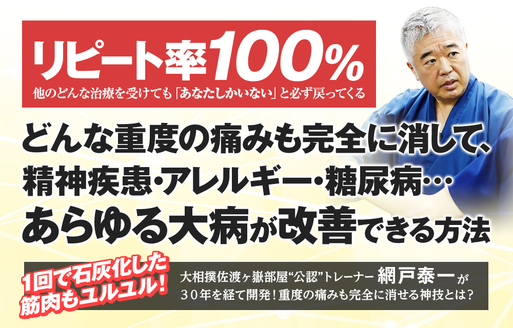 この治療法の開発者である網戸泰一先生は、大相撲「佐渡ヶ嶽部屋」の元専属トレーナーとして認められました。あの大相撲の世界から公式に実力が認められたこと。最前線で闘う力士たちの調整を任されたこと。そして、ゆうに180kgは超えるであろう大きな身体をたった1度の施術で緩めきれるということ。