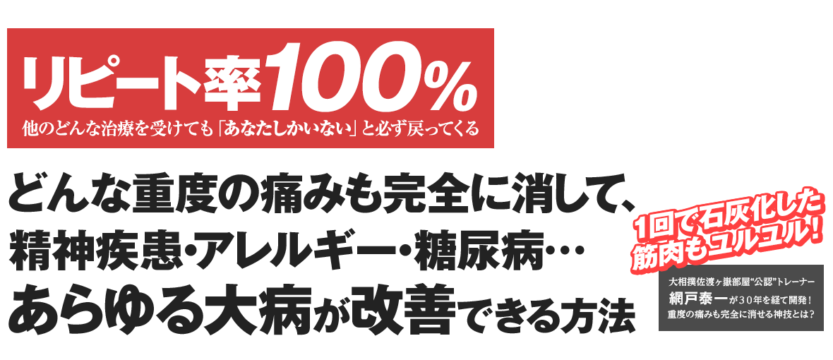石灰化した症状をはじめ、どんな痛みや症状も完全に消せるリピート率100%の治療法。