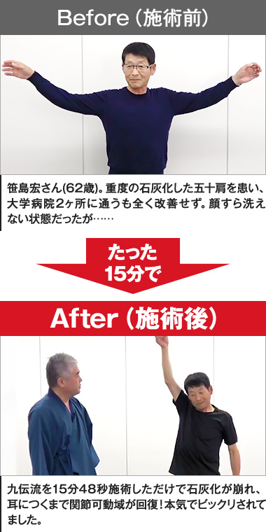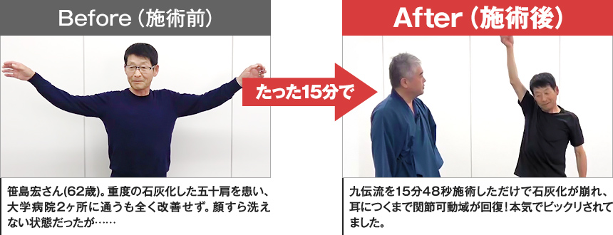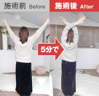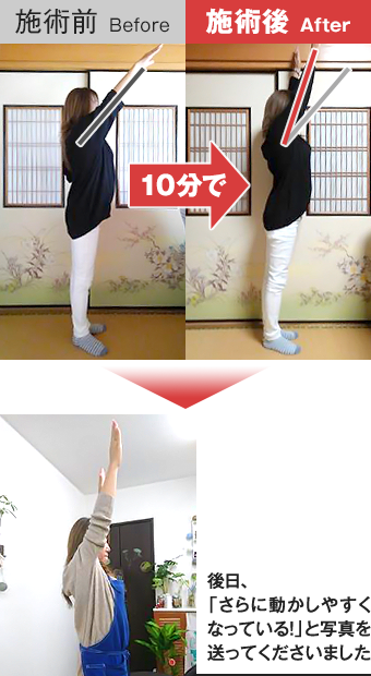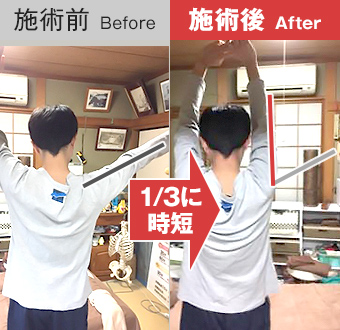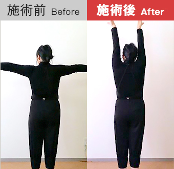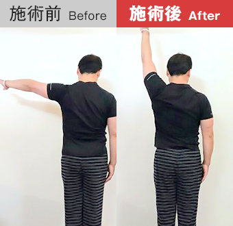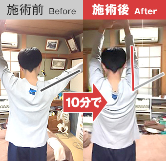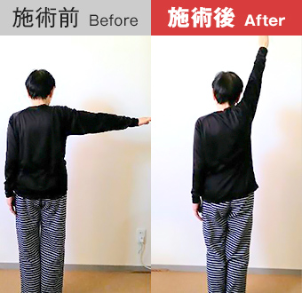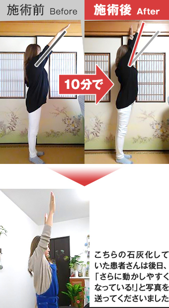 しかし、この治療法なら、そんなガッチガチに石灰化した五十肩に対しても全く次元が違うレベルの結果がでてしまうのです。その証拠に以下のBefore&Afterをご覧ください。