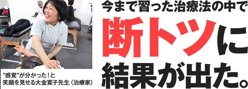 そう熱く語るのは、今まで数多くの凄腕治療家のセミナーに参加してきた藤井弥生先生(治療家)。かなり強めのリアクションを取っていただけましたが、彼女はサクラでも何でもありません。はじめてこの治療法を知ったその日に、純粋にその効果に驚き、感動し、「今までで一番よかった」と心からのコメントをいただけました。