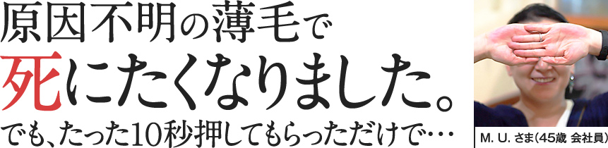 身体と心は表裏一体です。九伝流なら、重度の痛みだけではなく、うつ、パニック障害、統合失調症などのあらゆる精神ストレスからも解放させることができます。ただ精神的な疾患の場合は、改善の様子を視覚的に表現することが難しいので、証拠の1つとして“脱毛症”の改善事例をご覧いただきましょう。
