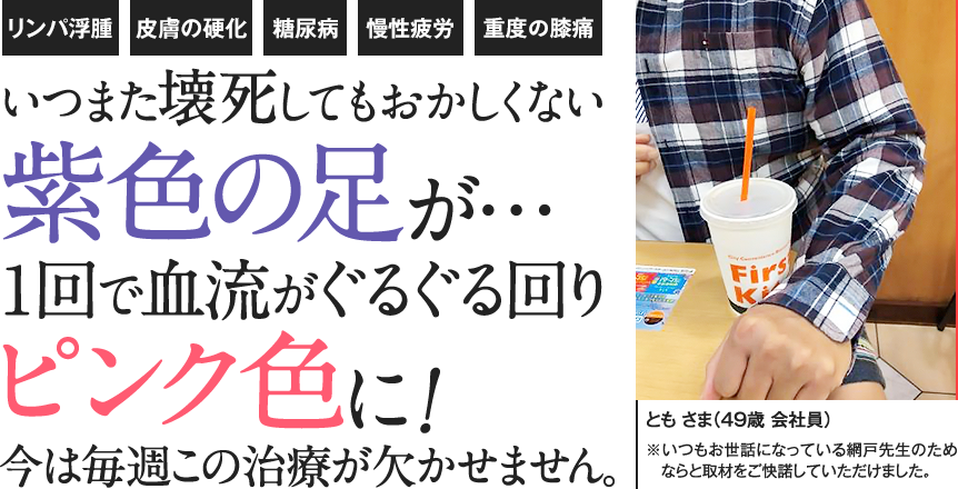 この治療法はとにかく素晴らしい。本当に元気になります。私自身の身体で実証済みですので間違いありません。一度受けた人はみんなそう思っていると思います。自分自身の話ですが、この治療法で老廃物をキレイに流しておけば、免疫力は当然上がります。また、心臓や肝臓、腎臓などの臓器の不調は、末梢の皮膚や筋肉、血流やリンパ流の不調となって現れてくるので、末梢を調整することで内臓の機能も回復していきます。免疫疾患や自律神経の乱れ、抗がん剤の副作用などまでお手のものです。この治療で復活したという人の話をいくつも聞いています。昔から本当に酷い患者さんは網戸先生に診てもらっています。
